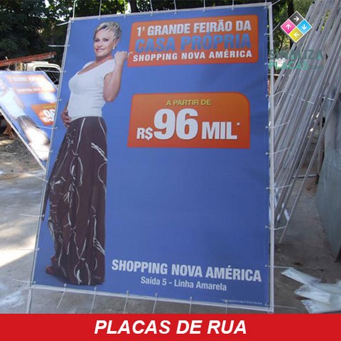 Placas (painés): Confeccionados em estrutura metálica tubular quadrada, chumbadas ao solo por meio de concreto. Face feita de metalon 50×30 com vergalhão liso de ¼” soldado em toda sua volta, com lona branca opaca impressa em alta resolução, dobrada com ilhoses e com reforço de corda de nylon , esticada a base de abraçadeiras reforçadas. Toda estrutura pintada de branco ou preto. Iluminação a base de refletores de vapor metálico blindado, com lâmpadas e reatores de 250watts / 400watts – 220v, interligados com cabos PP de 6mm e disjuntores, fixados com braços de metalon.