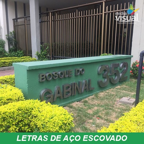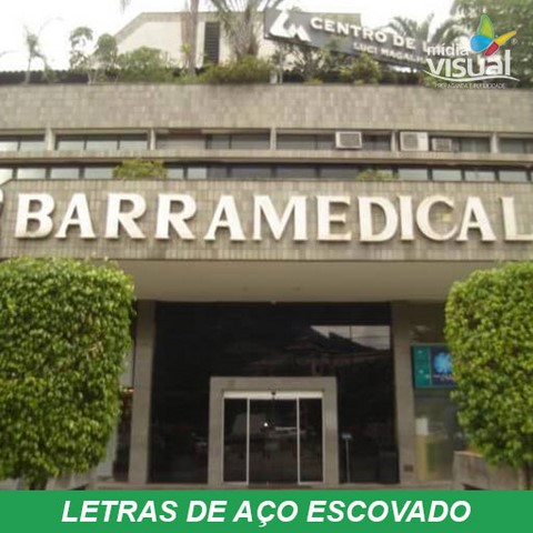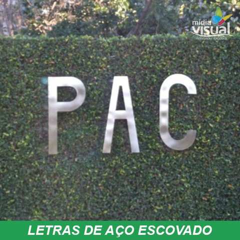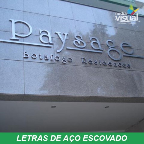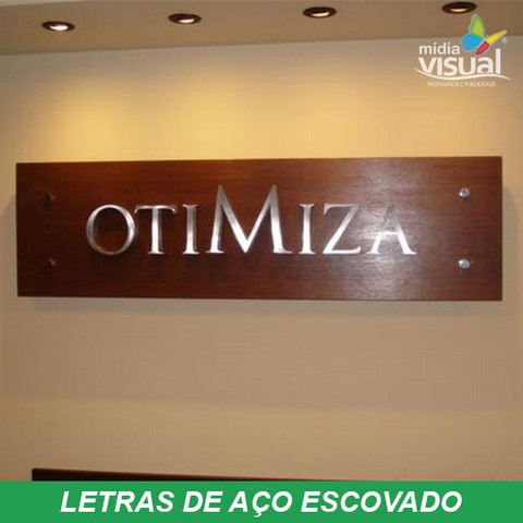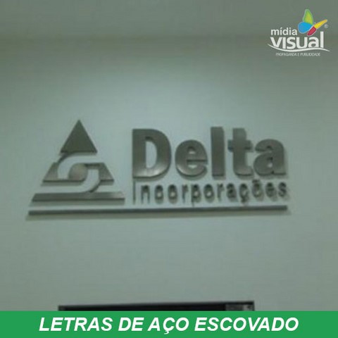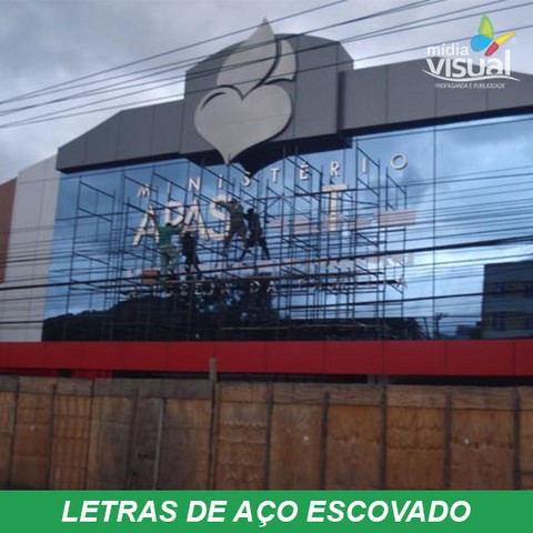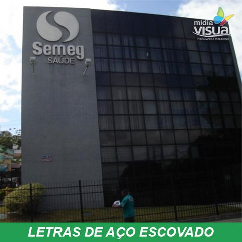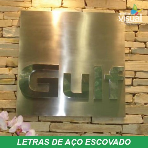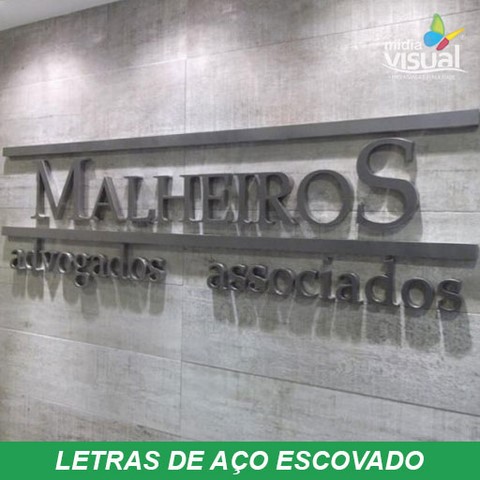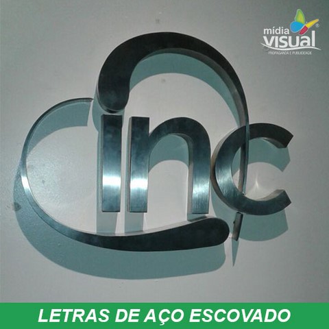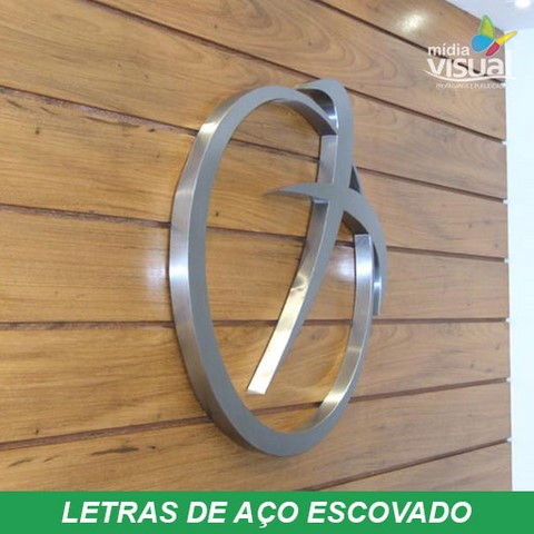Aço escovado inoxidável ( qualidade 304 ) confeccionadas a base de recorte a laser, montadas com soldas 50×50, lateral ( espessura ) de acordo com o tamanho das letras, fixação a base de pinos central, orelhas com ou sem afastamento, base para colar com fita dupla face ou cola especial. Para espessuras maiores que 25mm o acabamento é feito com tinta PU automotiva, fixadas a base de fita dupla face da 3m ou cola especial, podendo também ser com pinos central.