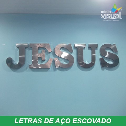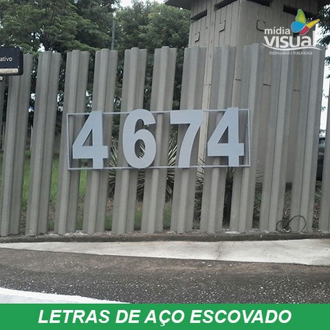 Aço escovado inoxidável ( qualidade 304 ) confeccionadas a base de recorte a laser, montadas com soldas 50×50, lateral ( espessura ) de acordo com o tamanho das letras, fixação a base de pinos central, orelhas com ou sem afastamento, base para colar com fita dupla face ou cola especial. Para espessuras maiores que 25mm o acabamento é feito com tinta PU automotiva, fixadas a base de fita dupla face da 3m ou cola especial, podendo também ser com pinos central.
