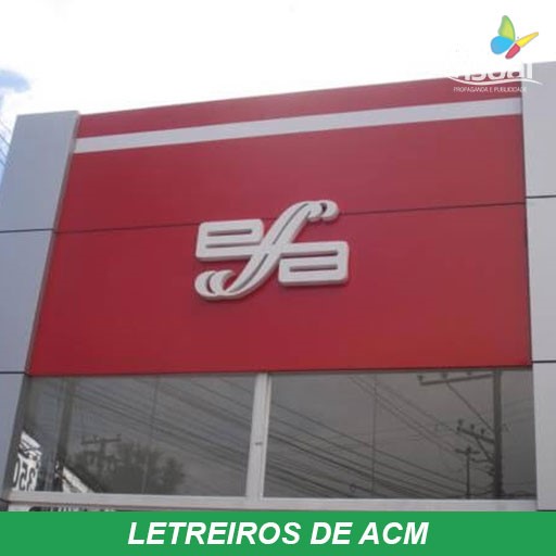 Na fabricação de letreiros no mundo atual, usamos o que há de mais moderno e com grande qualidade e durabilidade, para que a sua fachada de loja, revestimento da fachada ou um simples fundo de letreiro feito de ACM, moderno material, muito resistente ao tempo, fabricado em alumínio composto de dois lado com um composto de plástico rígido, em várias cores para sua escolha.