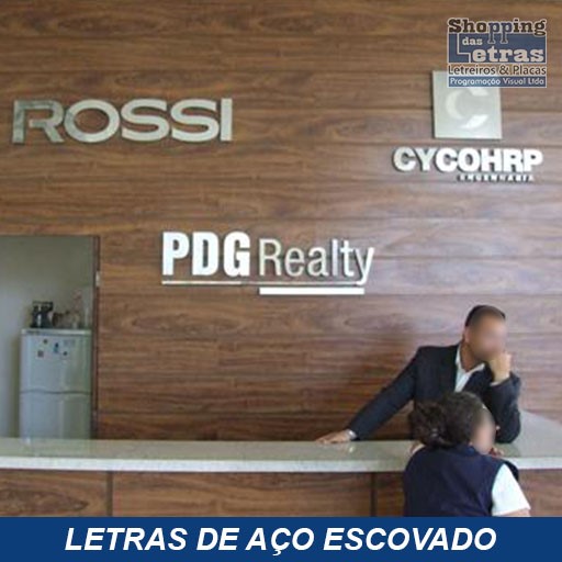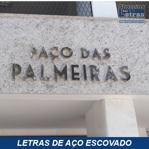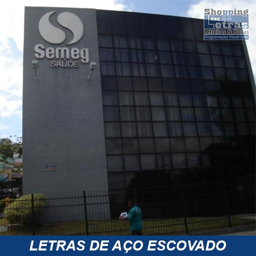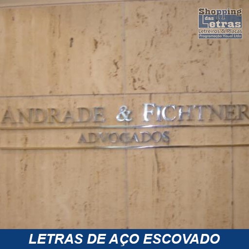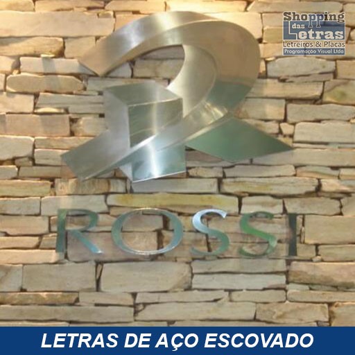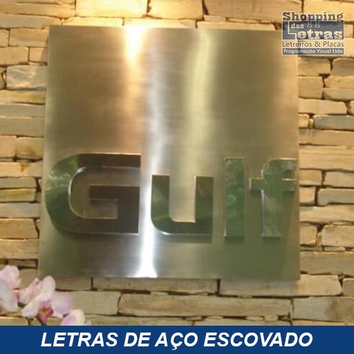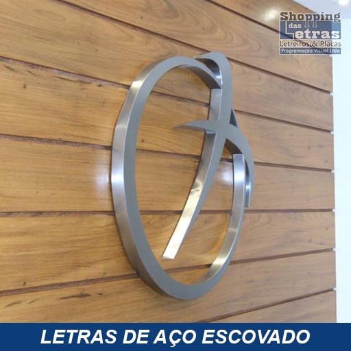 Aço escovado inoxidável ( qualidade 304 ) confeccionadas a base de recorte a laser, montadas com soldas 50×50, lateral ( espessura ) de acordo com o tamanho das letras, fixação a base de pinos central, orelhas com ou sem afastamento, base para colar com fita dupla face ou cola especial. Para espessuras maiores que 25mm o acabamento é feito com tinta PU automotiva, fixadas a base de fita dupla face da 3m ou cola especial, podendo também ser com pinos central.